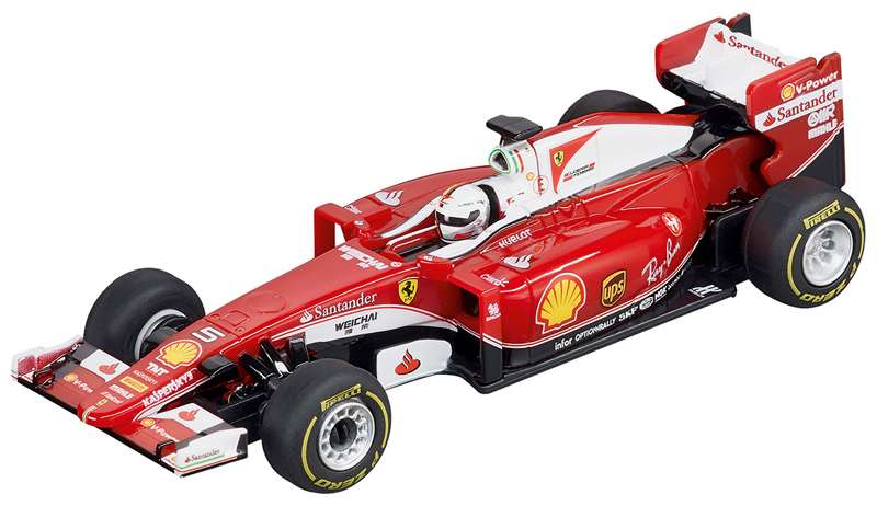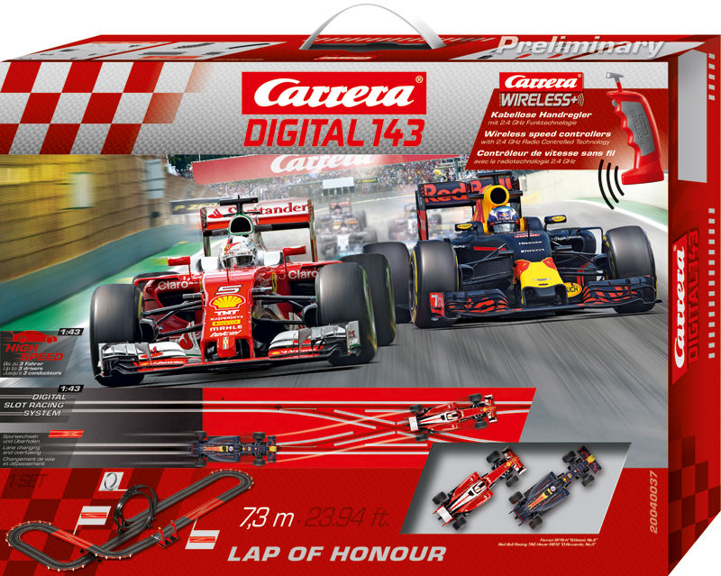 Bei dem Spitzenduell Ferrari gegen Red Bull im Carrera DIGITAL 143 Set Lap of Honour geht es um die Ehre der beiden Kontrahenten Vettel und Ricciardo. Mit ihren PS-Boliden mischen sie die Königsklasse gehörig auf und liefern sich ein brandheißes Rennen auf der 7,3 Meter langen Carrera Autorennbahn mit abwechslungsreicher Streckenführung, zwei Loopings sowie zwei Weichen für nervenaufreibende Überholmanöver. Der viermalige Formel-1-Weltmeister Sebastian Vettel geht mit seinem Ferrari SF16-H an den Start, um Herausforderer Daniel Ricciardo im TAG Heuer RB12 in einem packenden Rennen zu schlagen.