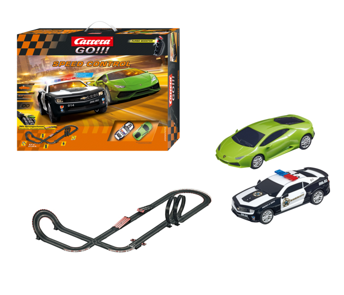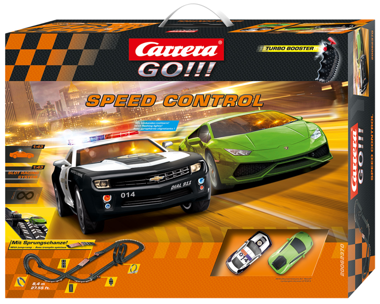 Wer hat die Power von hunderten PS am besten unter Kontrolle? Beim Carrera GO!!! Set ?Speed Control? gehen der Chevrolet Camaro "Sheriff" und der Lamborghini Huracán Sportwagen an den Start. Es wird ein spannendes Rennen. Die Strecke ist mit 8,4 Metern extra lang, superschnell und sehr anspruchsvoll. Highspeed-Gerade, Fly-Over, Looping! Auf der Sprungschanze zeigt sich, wer die Nerven behält und das Zeug zum Champion hat. Wer kann sein Fahrzeug sicher auf der anderen Seite landen? Nervenkitzel pur ist bei diesem Rennen vorprogrammiert!