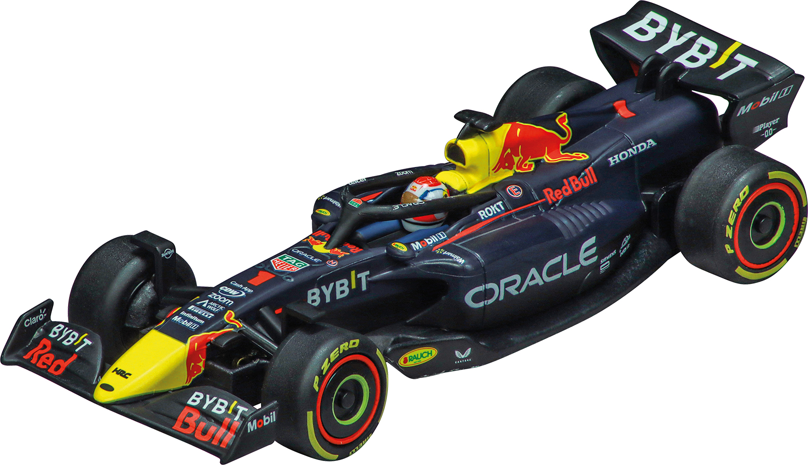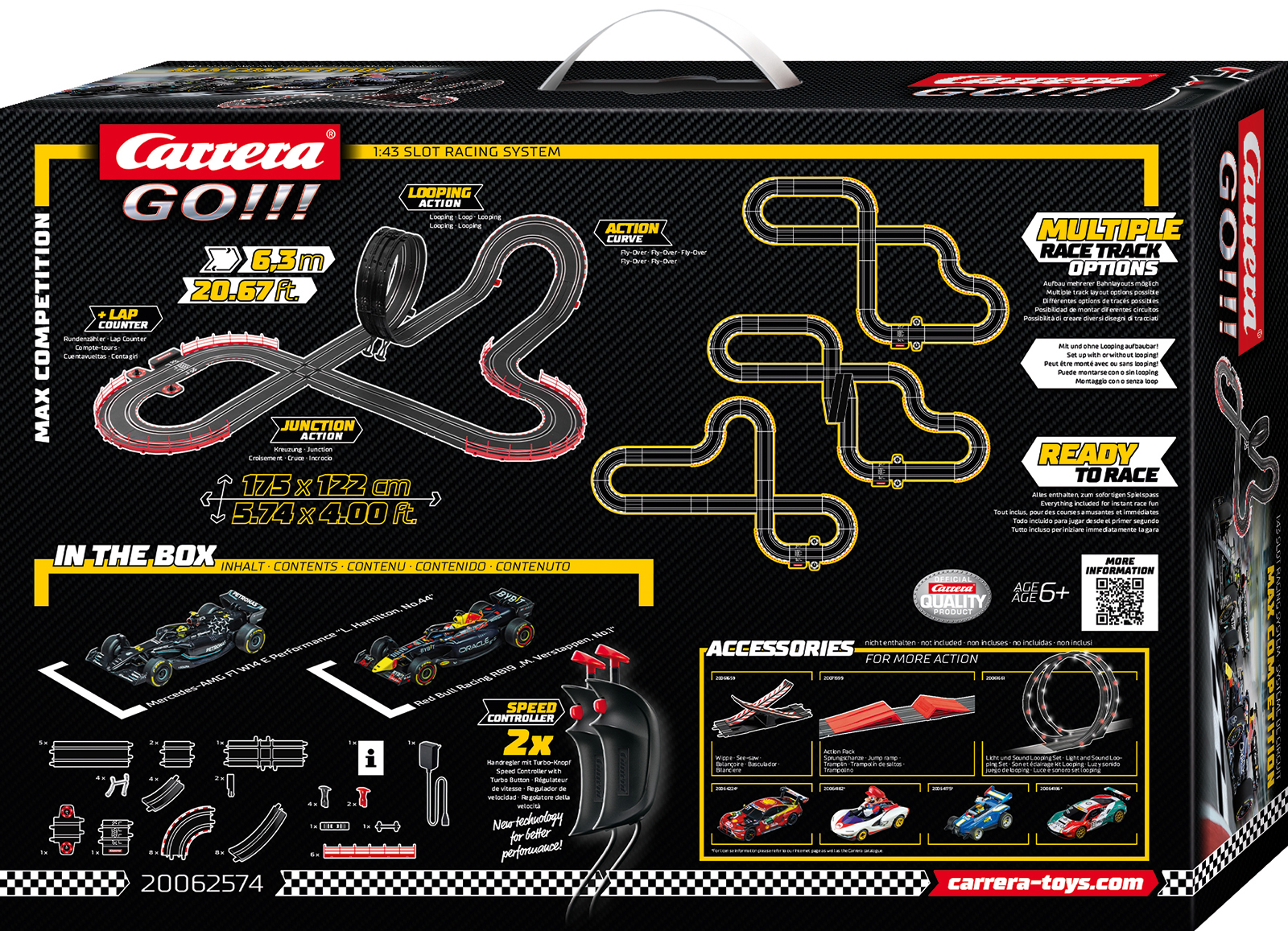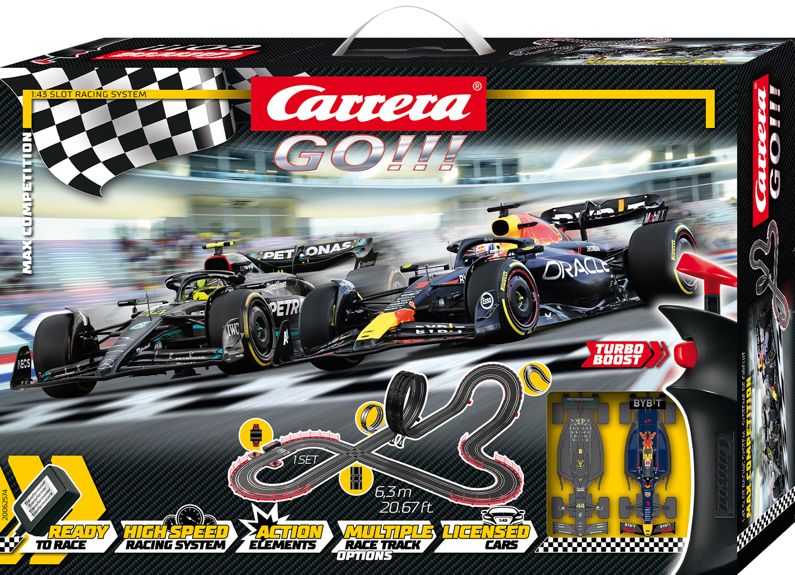 The Carrera GO!!! "Max Competition" set includes two high-performance Formula 1 racing cars. The speed of the Mercedes-AMG F1 W14 E Performance "L. Hamilton" from the Mercedes-AMG Petronas Formula One Team, and the power of the Red Bull Racing RB19 "M. Verstappen". The set enables fans to immerse themselves in the world of high-speed racing and participate in authentic Formula 1 races - at home. The 6.3-metre/20.67 ft. race circuit features ultra-fast straights, crossroads, and tempts drivers to risk high-speed overtaking manoeuvres.