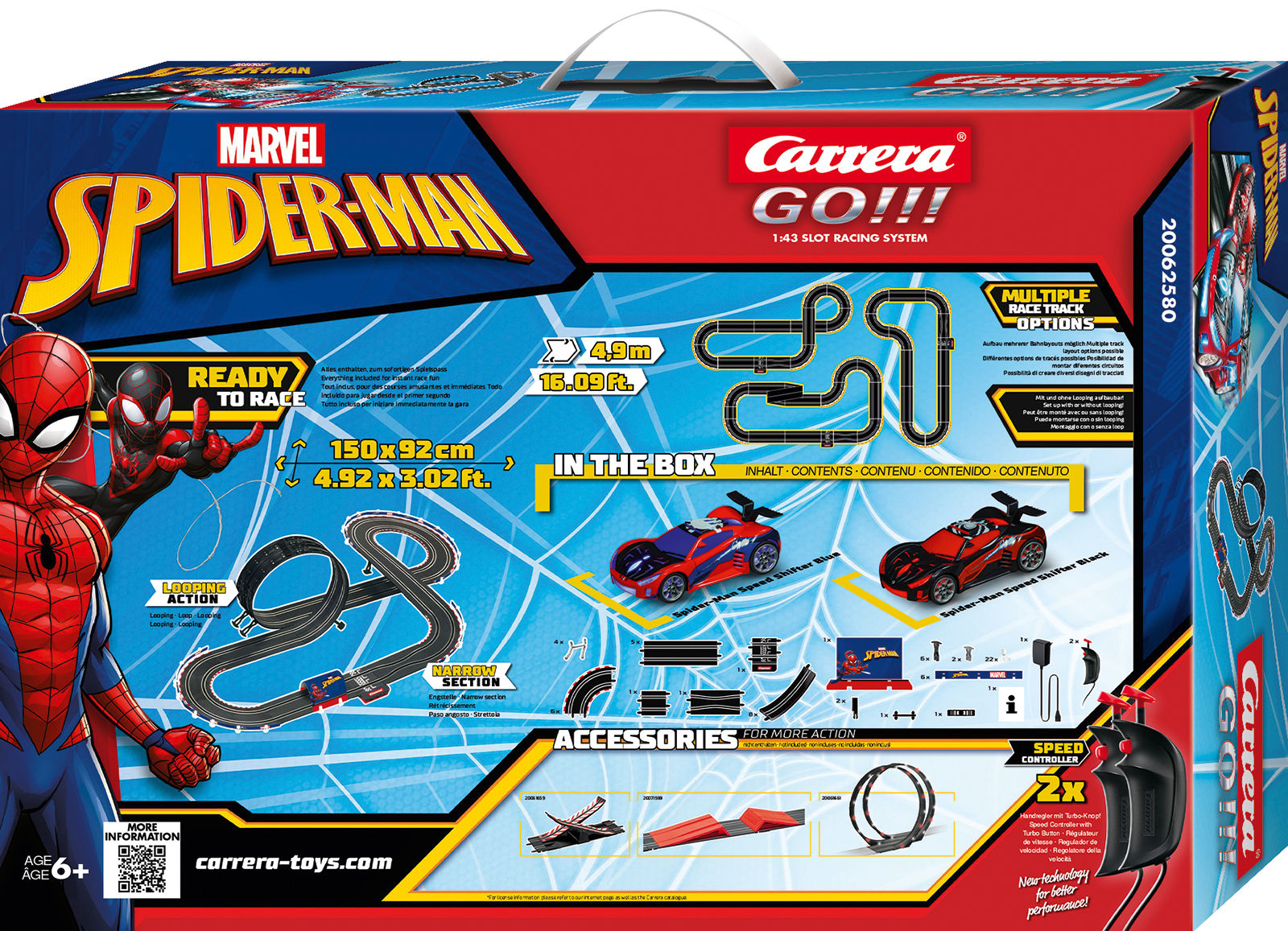 In the Carrera GO!!! set "Spider Racing," the Spider-Man Speed Shifter in red competes against his opponent in black - ensuring a challenging duel on the 4.9-meter/16.07 ft. track. The looping adds the necessary dose of action; it's full throttle on the straightaways, and the challenging curves test the drivers' skills to the fullest. In addition, young racers aged 6 and up must assert themselves to be the first to master the demanding narrow passage and stay ahead in the duel. For an extra burst of speed, the included hand controllers are equipped with Turbo Boost - but only those who keep their nerves will emerge as the ultimate winners in the end.