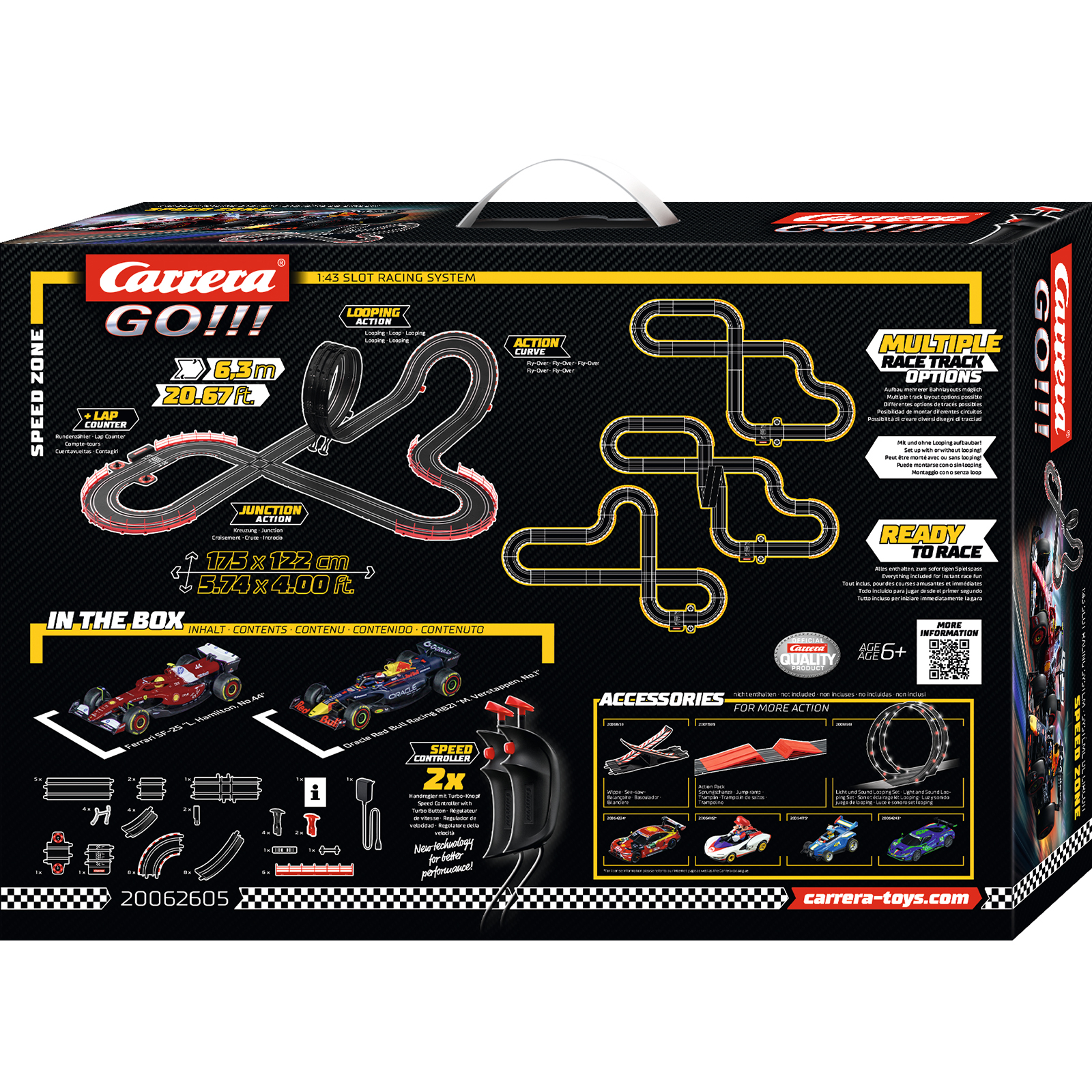 Set Speed ??Zone trifft zwei der größten Ikonen des Motorsports aufeinander: Max Verstappen im Oracle Red Bull Racing RB21 "M. Verstappen, Nr.1" und Lewis Hamilton im Ferrari SF-25 "L. Hamilton, Nr.44". Auf der spektakulären 6,3 Meter langen Strecke zeigen die Rennfahrer ihr Können – mit Highspeed-Geraden, scharfen Kurven und einem Looping sorgt die Rennbahn für adrenalingeladene Action. Detailgetreu gestaltete Fahrzeuge und abwechslungsreiche Streckenelemente holen die packende Atmosphäre der Formel 1 direkt ins eigene zu Hause. Jetzt heißt es: Gas geben und beweisen, wer der Schnellste auf der Strecke ist!