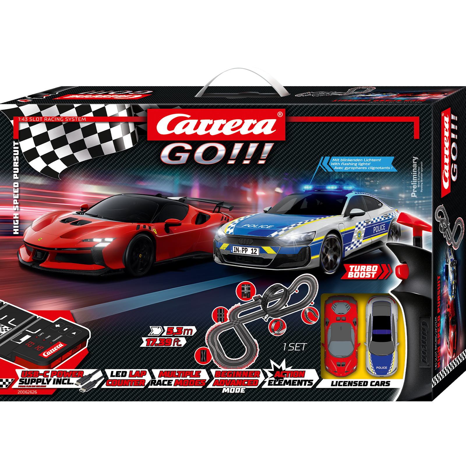Die Carrera GO!!!-Strecke kann mit wählbaren Geschwindigkeitsstufen an das Fahrkönnen angepasst werden.